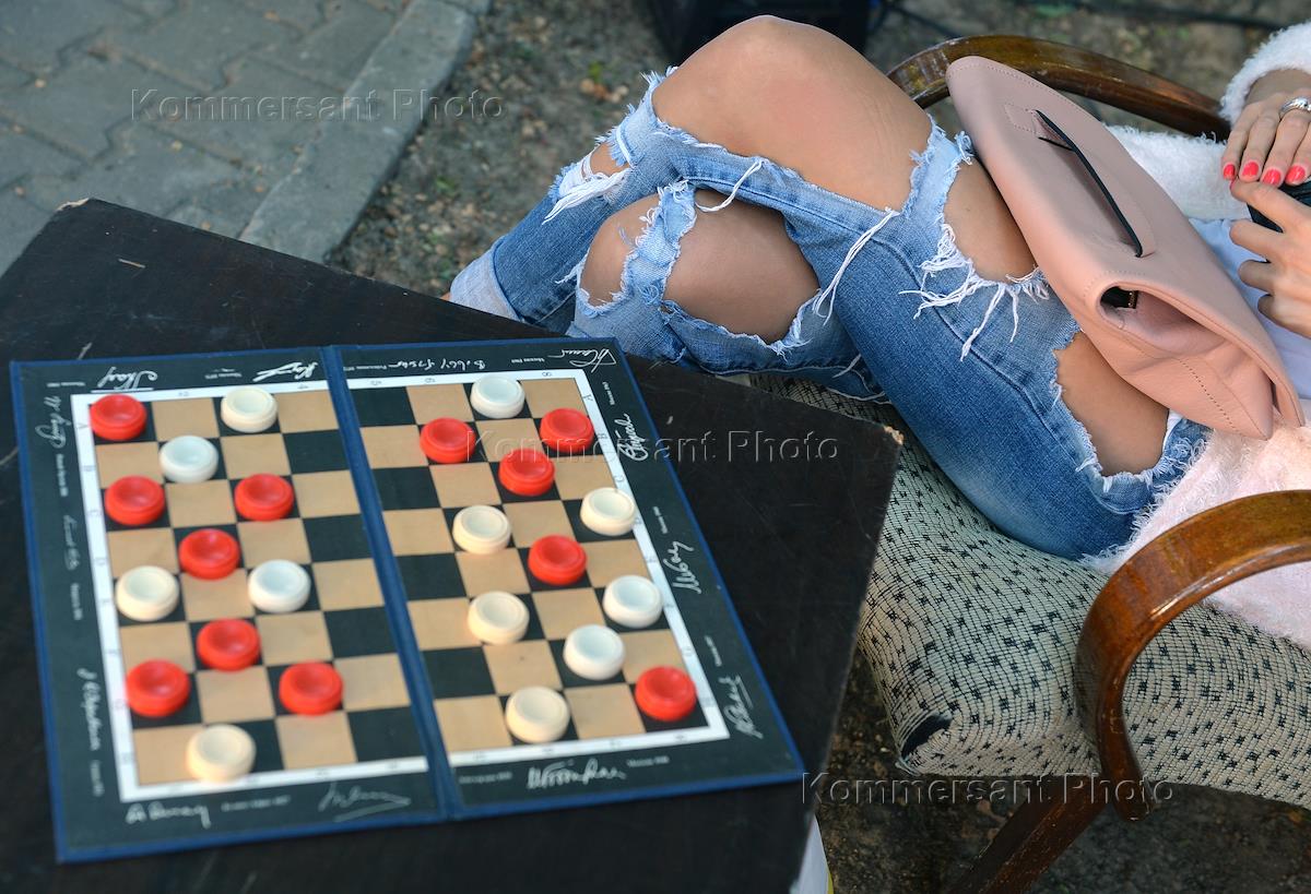 Празднование Дня рождения радиостанции "Коммерсантъ-FM". Участники праздника во время игры в шашки.