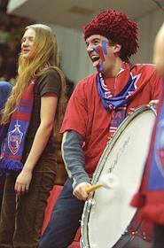 Болельщики баскетбольной команды ЦСКА с большим барабаном на трибуне во время встречи между…