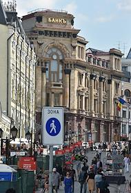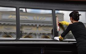 Виды Москвы. Уборщица моет окна кафе улице Неглинной. Отражение в окнах здания Центрального Банка…