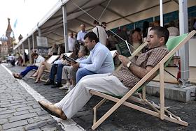 Московский международный книжный фестиваль "Книги России". Посетители у студии радио "Коммерсант FM"…