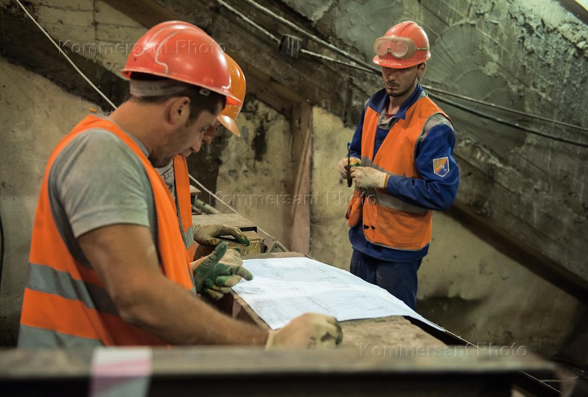 Рабочие во время работы по замене эскалатора и реконструкции вестибюля станции "Бауманская"…