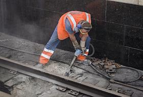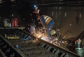 Рабочий во время ремонтных работ на закрытом участке Сокольнической линии Московского метрополитена.