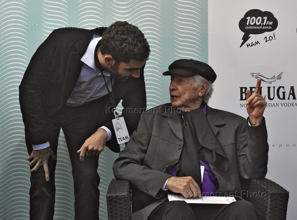 Актер Александр Носик (слева) на церемонии открытия выставки "Lexus Hybrid Art 2015" в кинотеатре…