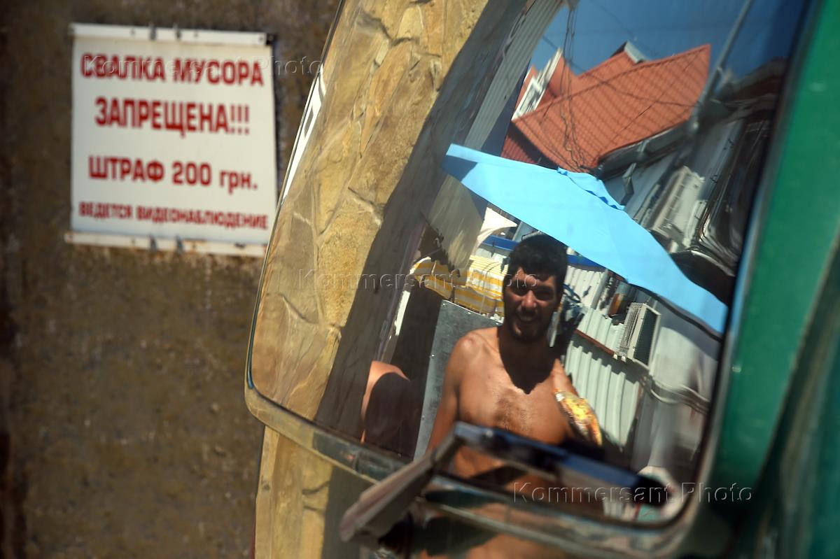 Жанровая фотография. Отражение мужчина в боковом зеркале автомобиля. Объявление на стене "Свалка…