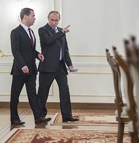 Председатель правительства России Дмитрий Медведев (справа) и президент России Владимир Путин…
