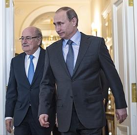 Глава Международной федерации футбола (FIFA) Йозеф Блаттер (слева) и президент России Владимир Путин…