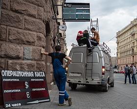 Жанровая фотография. Виды Москвы. Установка информационного табло пункта обмена валют на улице 1-я…