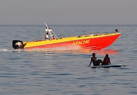 Жанровая фотография. Виды Алушты. Катер и отдыхающие на Черном море.