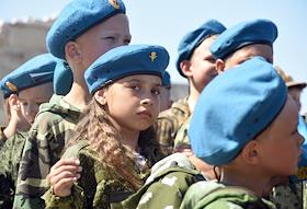 Празднование Дня Воздушно-десантных войск (ВДВ) России в городе. Дети в форме десантников.