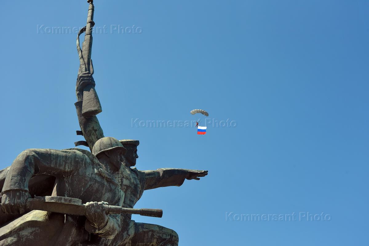 Празднование Дня Воздушно-десантных войск (ВДВ) России в городе. Парашютист в небе с Государственным…