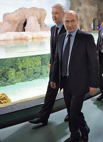 Президент России Владимир Путин и мэр Москвы Сергей Собянин во время посещения Центра океанографии и морской биологии "Москвариум" на ВДНХ.
