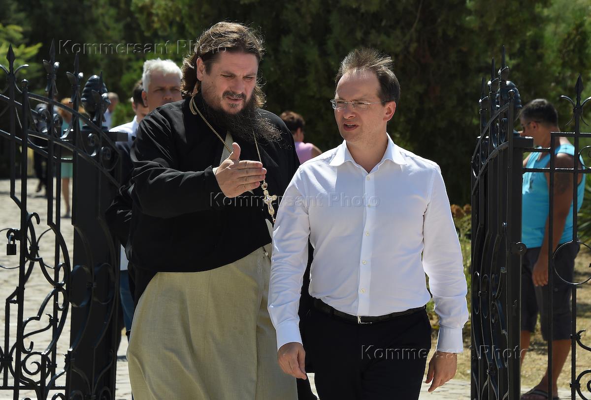 Протоиерей Сергей Халюта (слева) и министр культуры России Владимир Мединский (справа) в…