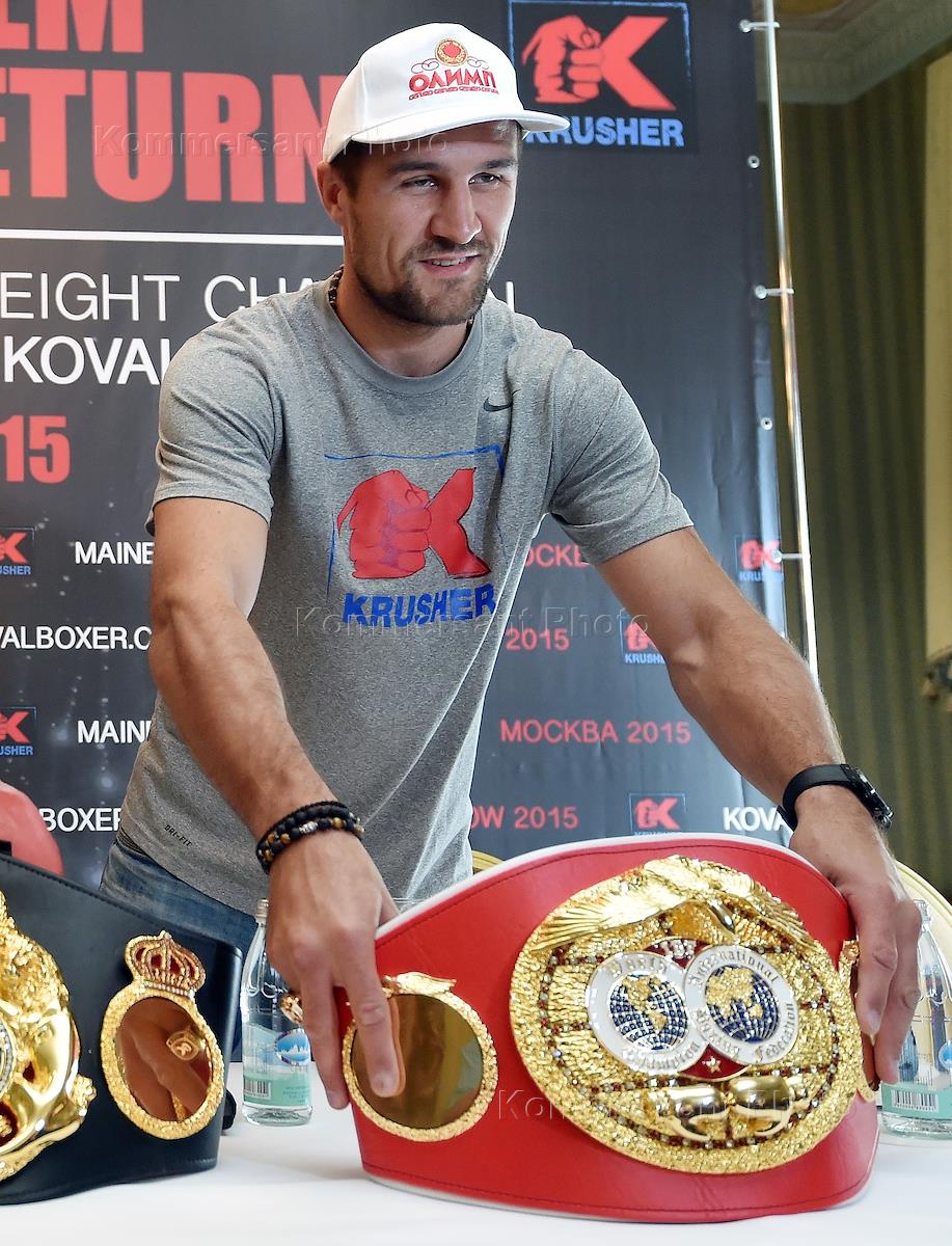 Российский боксер, чемпион мира по версии WBA, IBF и WBO Сергей Ковалев во время пресс-конференции в…