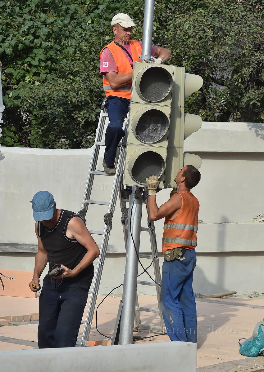 Жанровая фотография. Рабочие во время установки нового светофора на Тверском бульваре.