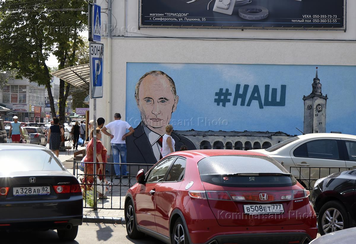 Жанровая фотография. Граффити с изображением президента России Владимира Путина и вокзала Симферополя на стене.