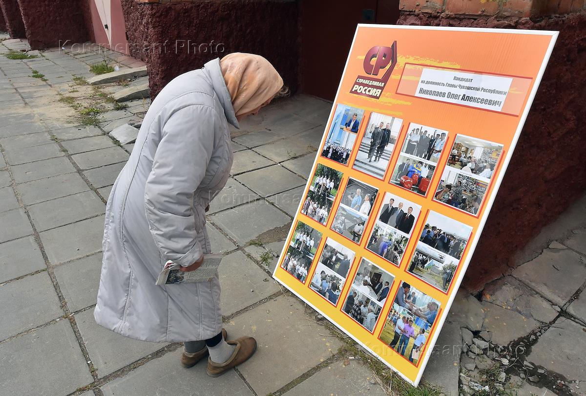 Предвыборная кампания в Чебоксарах. Женщина читает агитационный стенд кандидата на пост Главы…