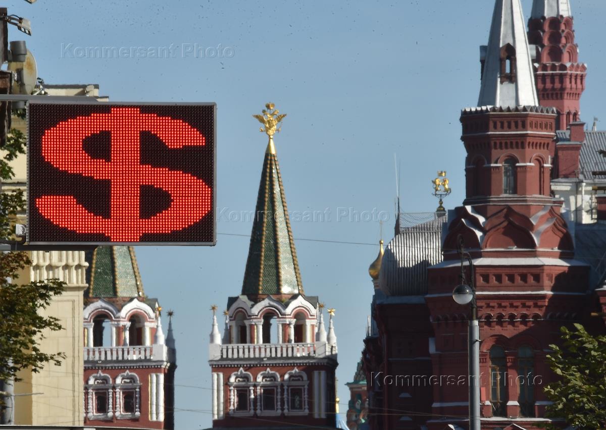 Жанровая фотография. Информационное табло пункта обмена валют на фоне Кремля.