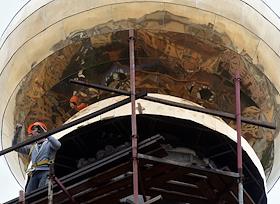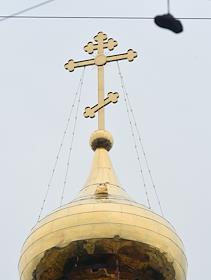 Фасад дома № 24 по Лахтинской улице напротив строящейся церкви Ксении Блаженной, на котором был барельеф Мефистофеля, подвергшийся акту вандализма