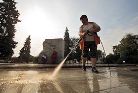 Жанровая фотография. Рабтник коммунальных служб моет тротуар.