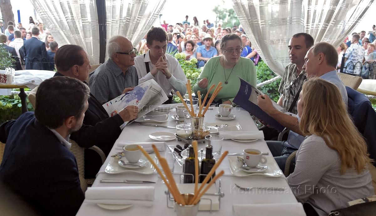Политика Рабочая поездка президента РФ В.Путина в Крымский федеральный округ. Президент России Владимир Путин и бывший премьер Италии Сильвио Берлускони во время прогулки по ялтинской набережной в Крыму.