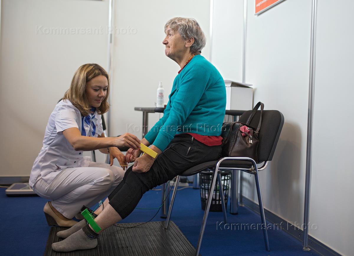 V Московский Форум "Москвичам-здоровый образ жизни" на ВДНХ. Пациентка во время снятия кардиограммы…