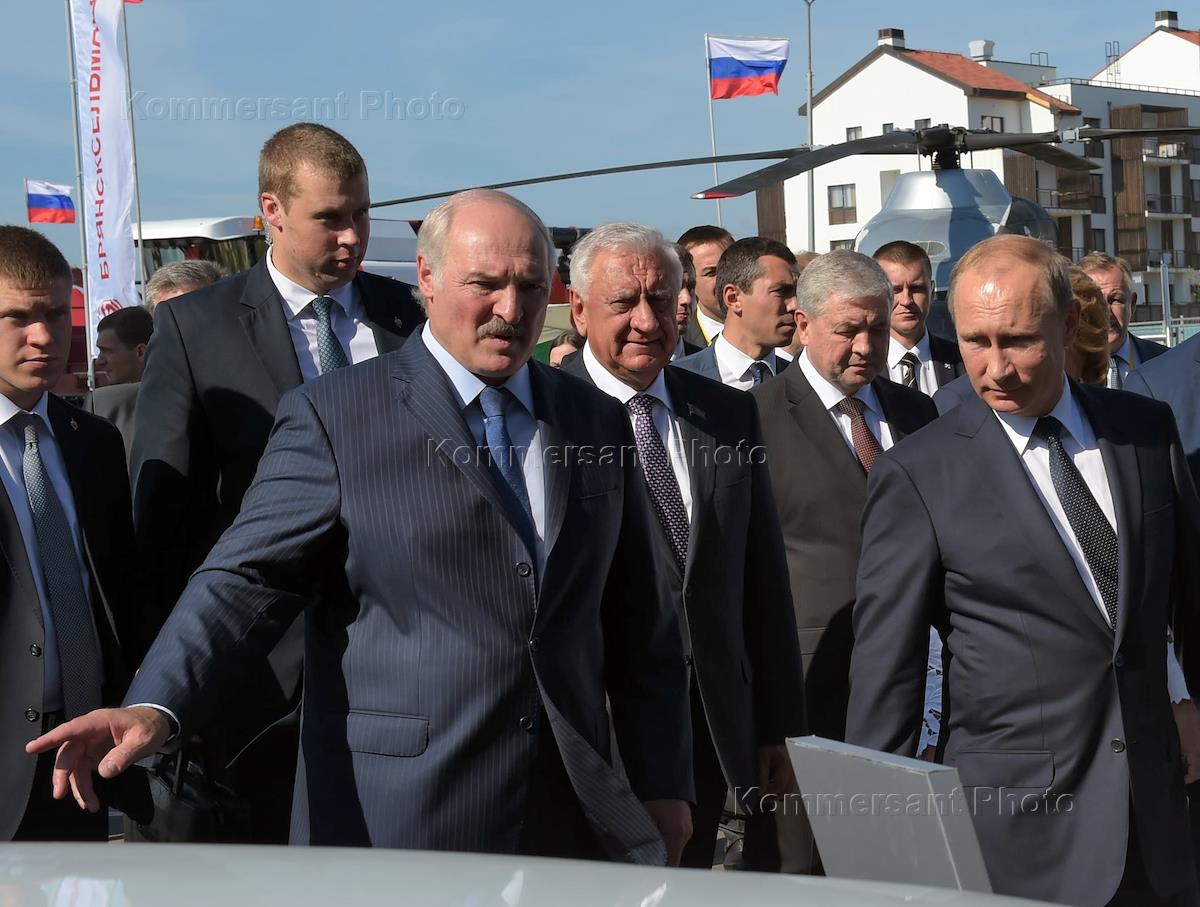 Президент России Владимир Путин (справа) и президент Белоруссии Александр Лукашенко (в центре) во…