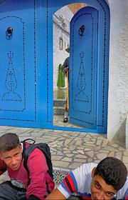 Виды Тунис. Пожилой мужчина сидит на пороге дома.