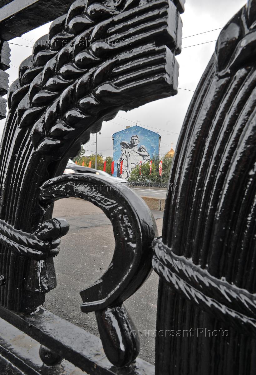 Жанровая фотография. Граффити на стене дома с изображением советского солдата освободителя с…