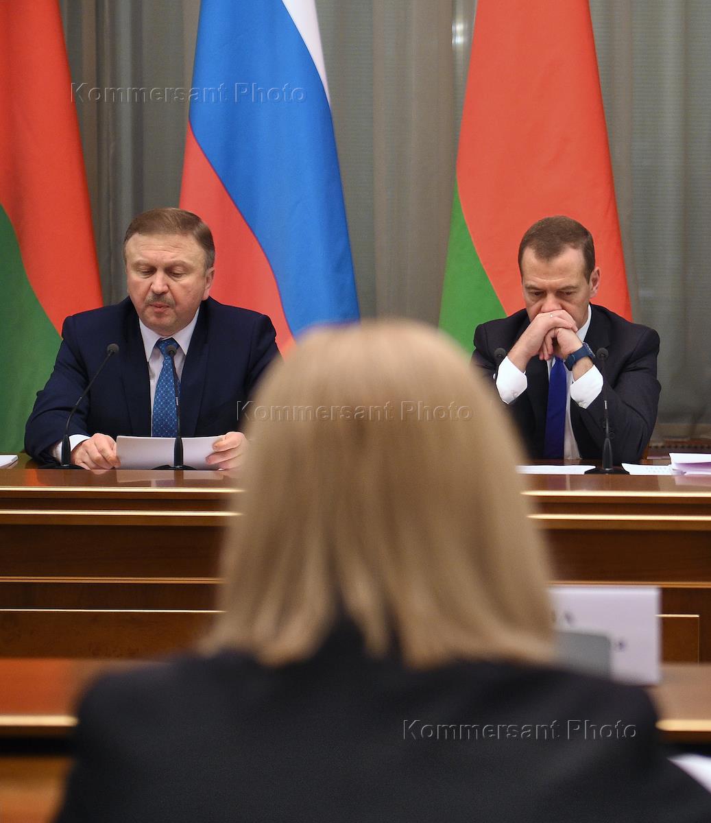 Председатель правительства России Дмитрий Медведев (слева) и премьер-министр Белоруссии Андрей…