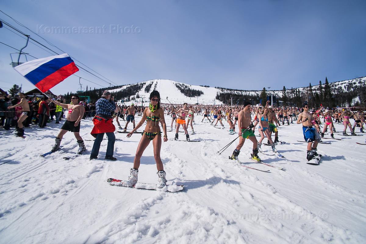 18 апреля в Шерегеше 1835 человек установили новый рекорд Гиннесса по самому массовому спуску с горы в купальниках.