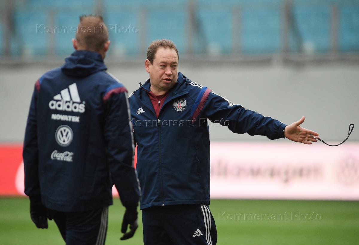 Главный тренер сборной России по футболу Леонид Слуцкий во время тренировки сборной на стадионе…