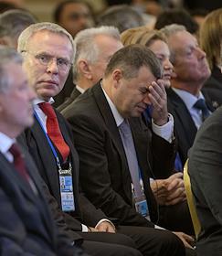 Фигурист Евгений Плющенко (слева) на церемонии открытия первого Всемирного форума олимпийцев (WOF).