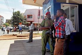 Виды города Моши (Moshi). Жанровая фотография. Вооруженный охранник у здания банка.