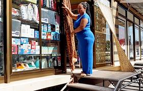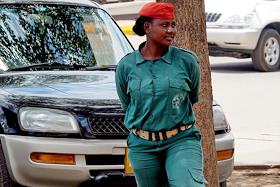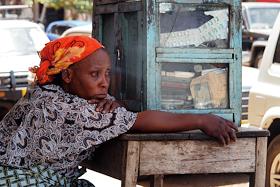 Виды города Моши (Moshi). Жанровая фотография. Женщина-охранник возле кафе, популярного у…