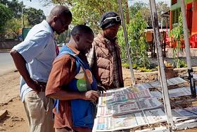 Виды города Моши (Moshi). Жанровая фотография. Покупатели у лотка с газетами.