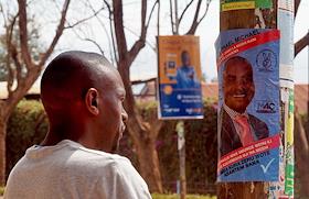 Виды города Моши (Moshi). Жанровая фотография. Прохожий рассматривает предвыборный плакат.