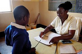 Мунициппальная начальная школа "Мавензи". Учительница проверяет письменное задание ученика в тетради.