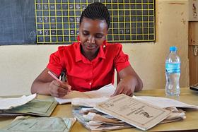 Жанровая фотография. Мунициппальная начальная школа "Мавензи". Учитель за столом в классе.