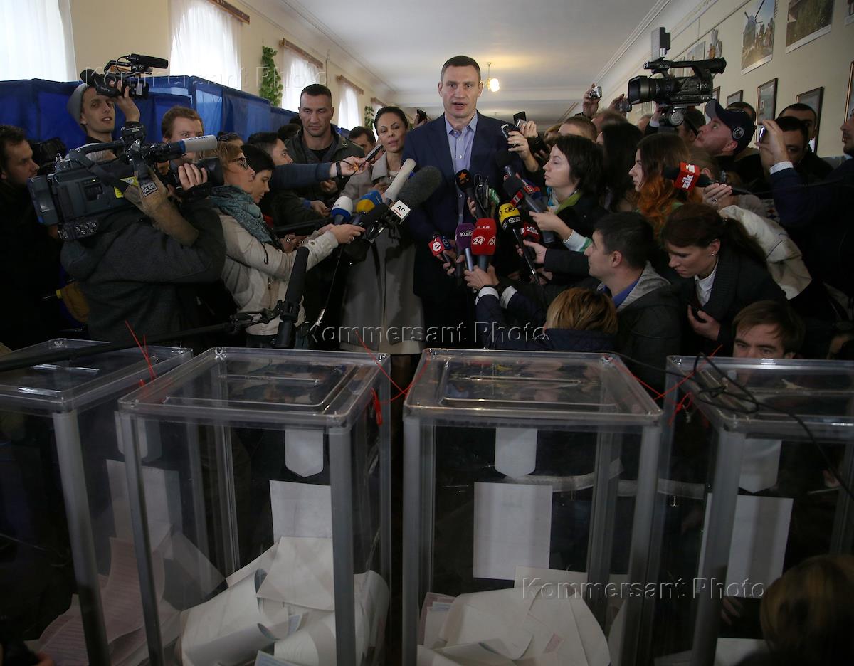 Мэр города Киева Виталий Кличко во время интервью прессе на выборах мэра и кандидатов в депутаты…