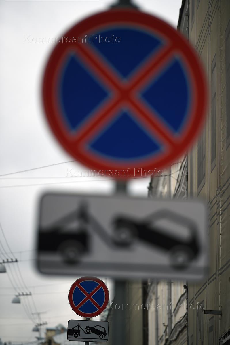 Жанровая фотография. Дорожный знак отсутствия парковки для автомобилей. Работает эвакуатор.