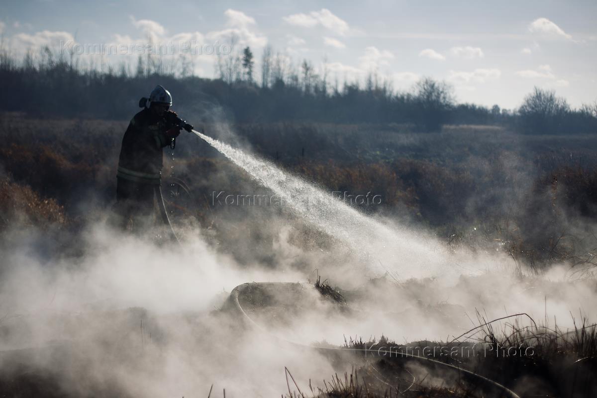 Сотрудники МЧС России во время тушения возгорания торфа вблизи Калининграда.