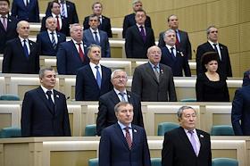 Члены Совета Федерации (СФ) России во время исполнения Государственного Гимна России перед началом…