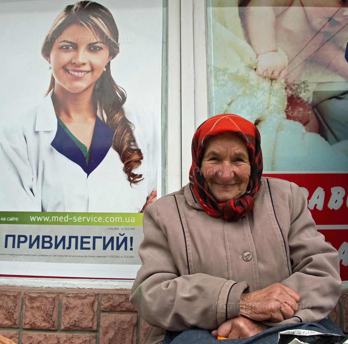 Виды Белогорска. Жанровая фотография. Пожилая женщина на фоне рекламы медицинских услуг.
