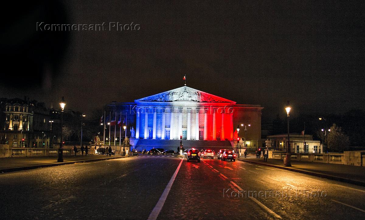 Здание Национальной Ассамблеи Франции, подсвеченное в цвета французского флага в память о жертвах…