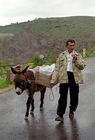 В Ереване все спокойно. Крестьянин с груженым поклажей осликом на горной дороге в Котайкской…