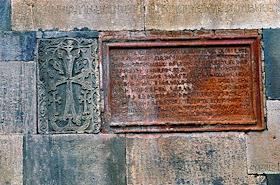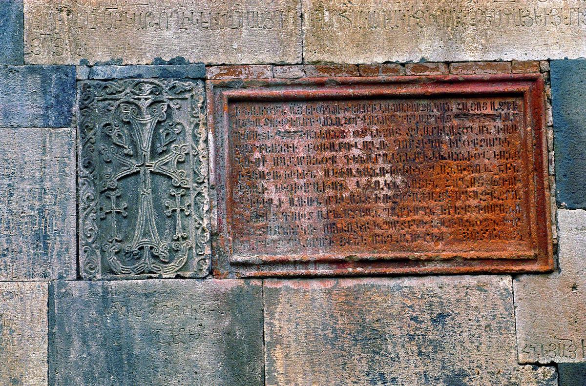 Древние евангельские письмена в камне фрагмента стены. Древний монастырь Армении IV века ГЕГАРД…