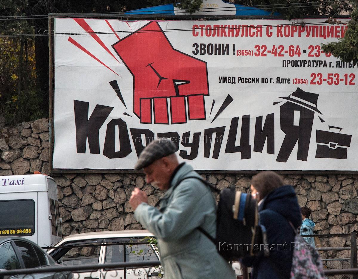 Жанровая фотография. Плакат с надписью "Столкнулся с коррупцией - звони" на улице города.