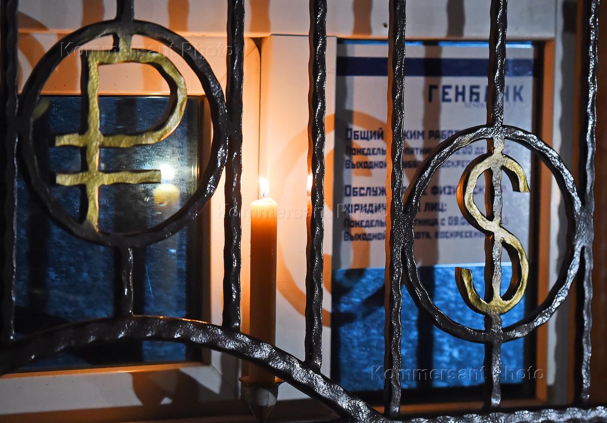 Жанровая фотография. Кованая решетка на окнах отделения "Генбанка". Символы рубля и доллара.