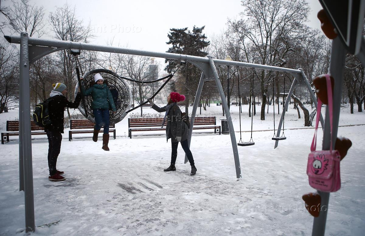 Жанровая фотография. Снегопад в Москве. Дети катаются в парке на качелях.