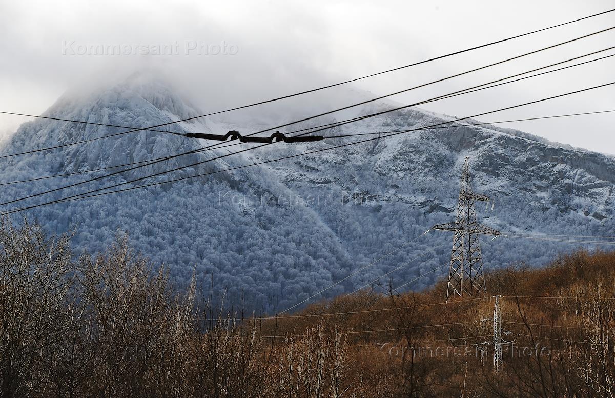 Жанровая фотография. Виды Крыма. Линия ЛЭП на фоне лесного предгорья в инее.